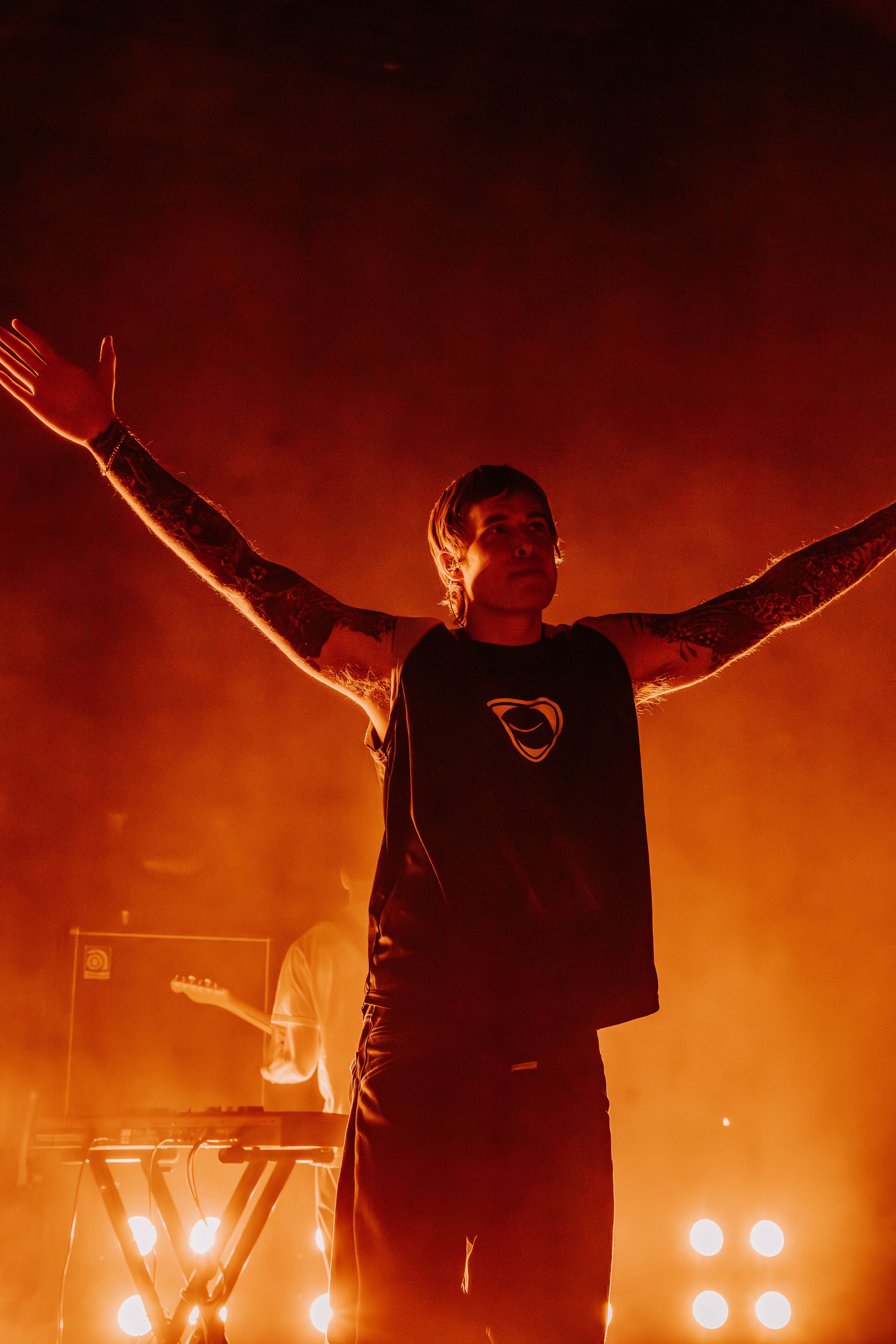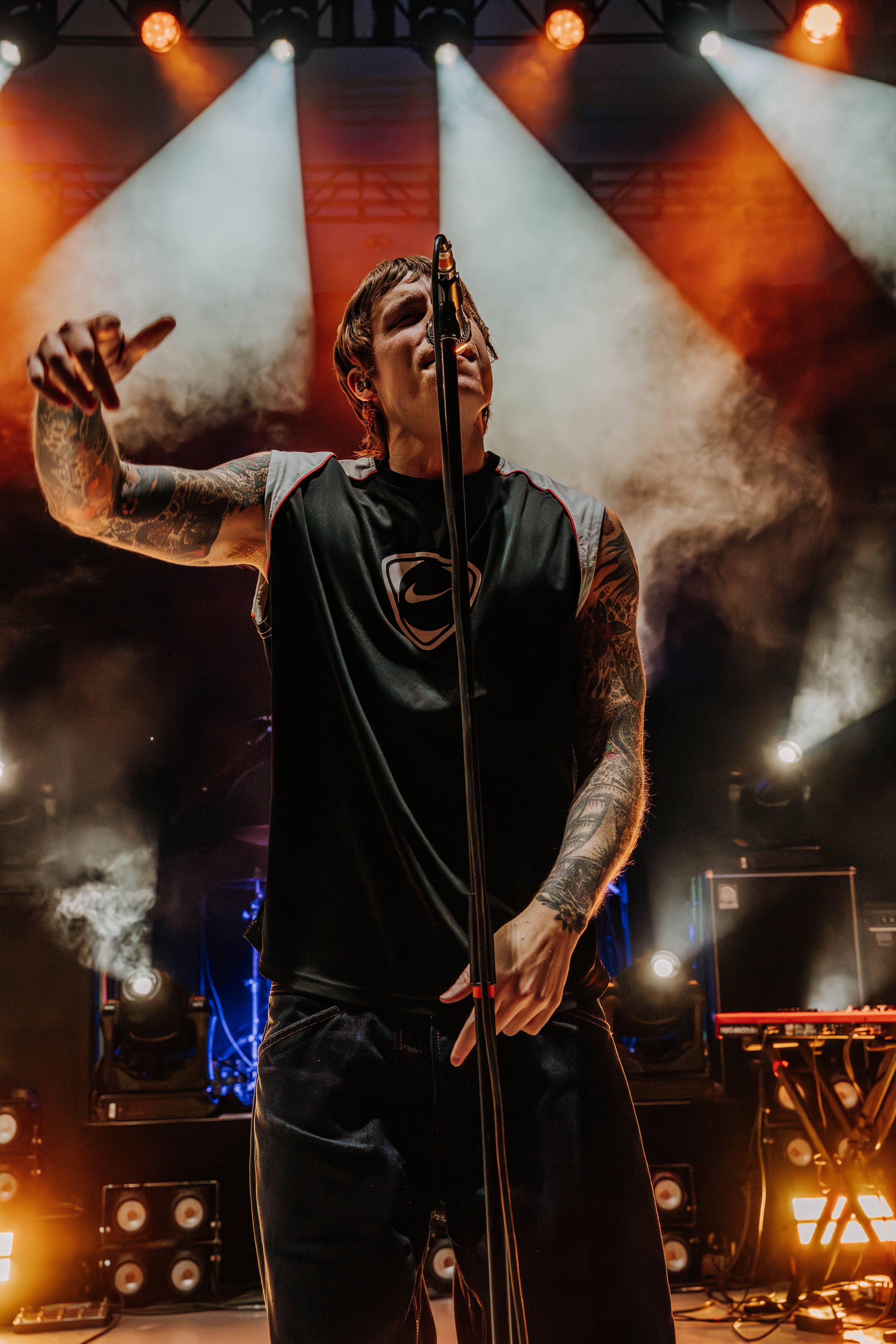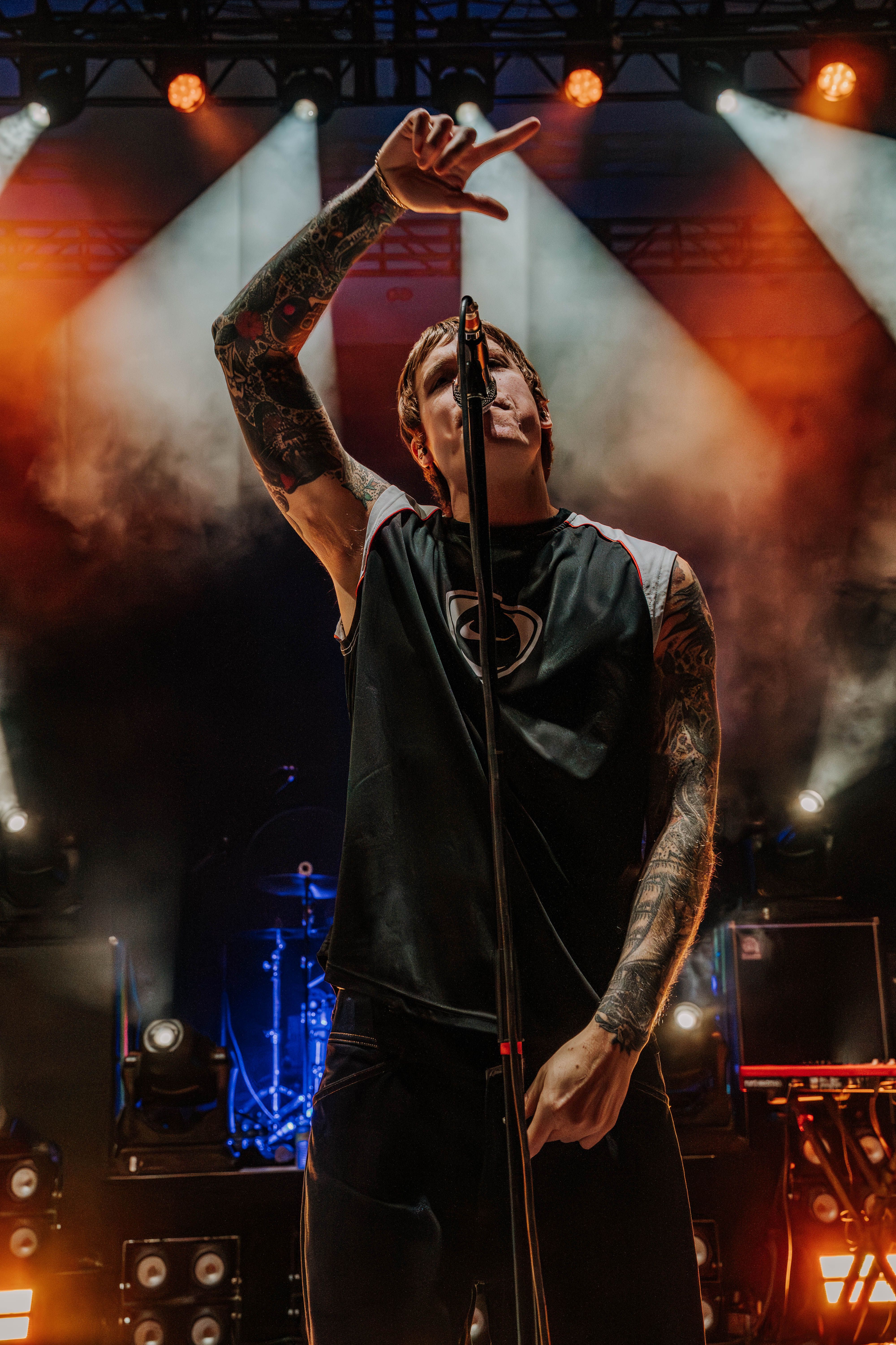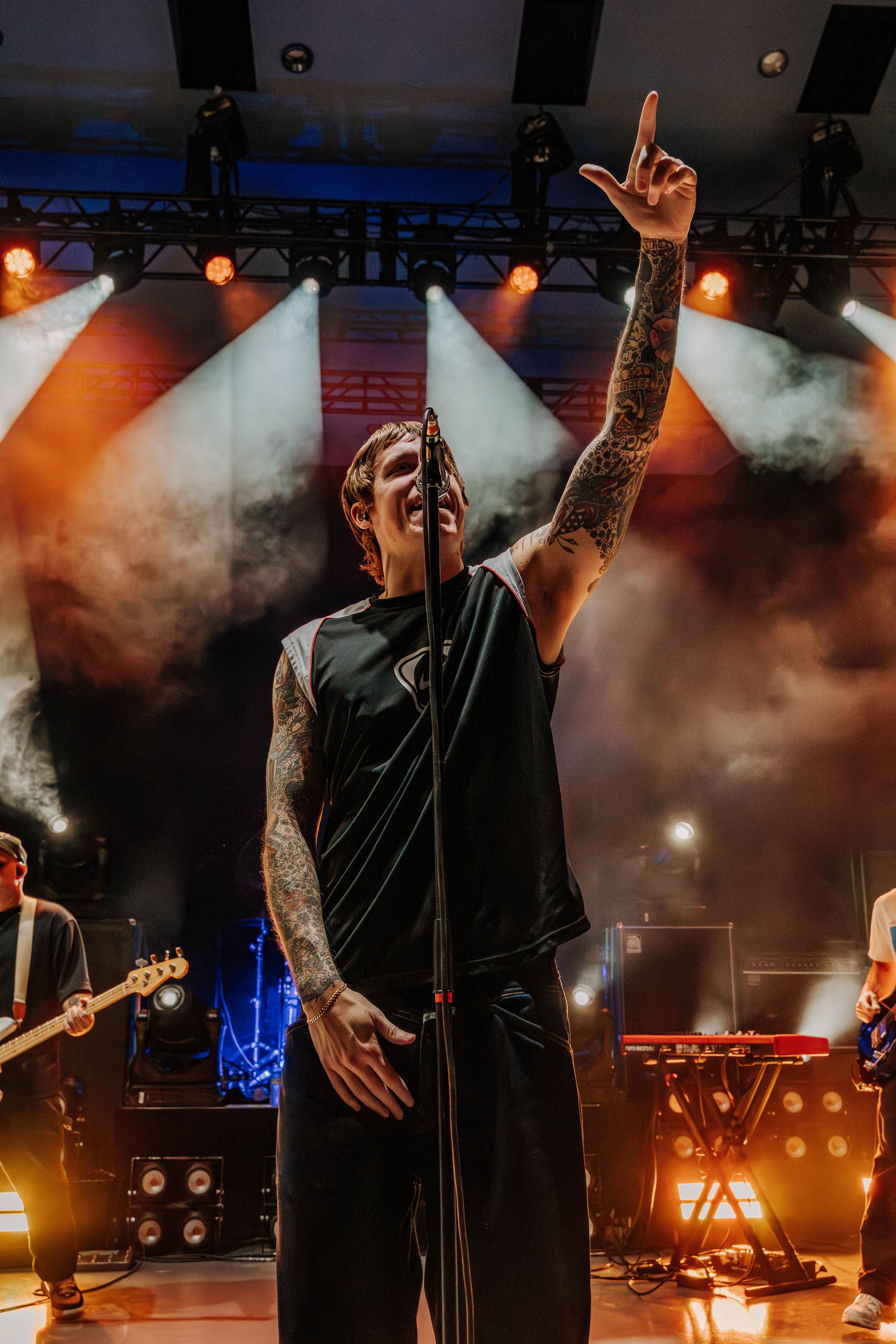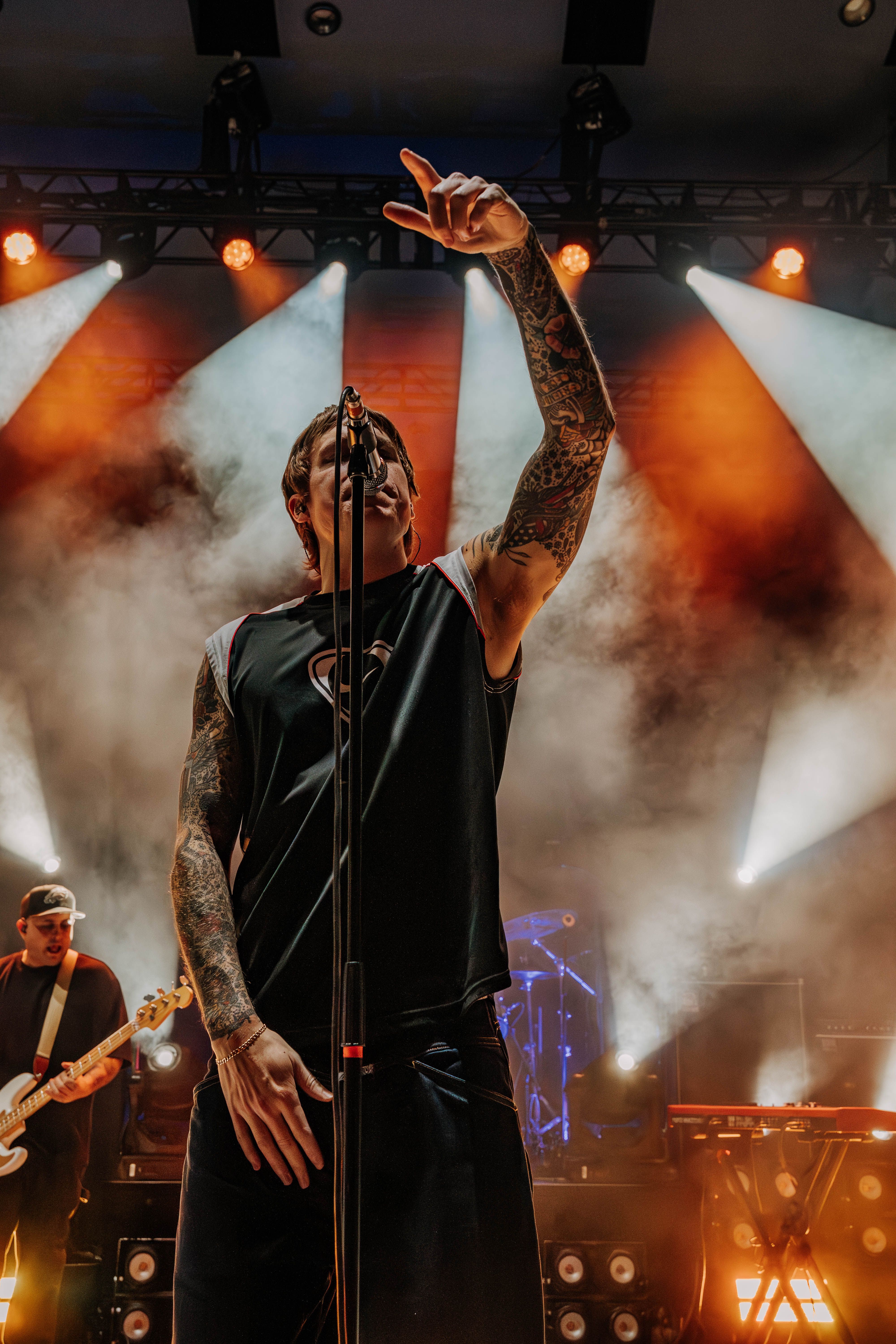 Neck Deep kicked things off, and the crowd didn’t need any warming up. From the first note, the energy was already at full tilt. Ben Barlow took command with his usual mix of charm and sharp vocals, moving across the stage with the kind of urgency that only comes from a band fully in its stride. Their set pulled from all corners of their discography—fan favorites like “December” and “In Bloom” landed just as hard as newer cuts. Barlow made a point to thank the crowd for showing up, acknowledging the weather and the distance some had traveled, which only added to the feeling that this night was something special. Despite the steady rain, fans didn’t budge—if anything, it made the singalongs louder, more unified, like the weather was just another element to conquer together.